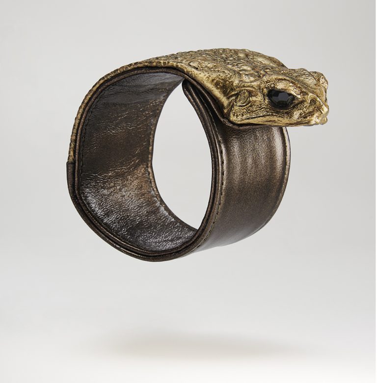 Bronze Bracelet Frog, in genuine Rhinella Marina leather. Each piece is unique, handcrafted in our Parisian workshop. The features, size and singularity can vary from one frog to another. Fabrication requires a long manufacturing process and no less than 17 steps. Eco-friendly, Kobja works with associations of animal welfare, which hunt this species of amphibian, because today it unbalances all Oceanian fauna and flora.